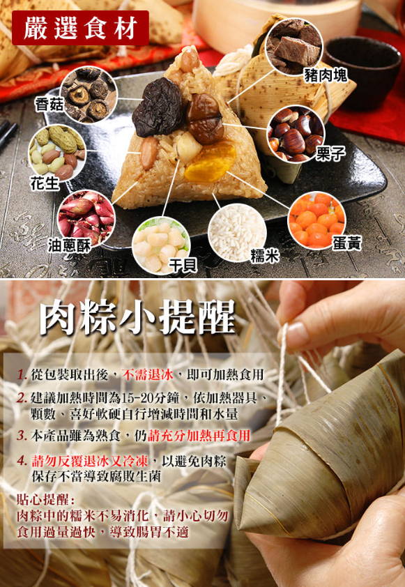 商品名稱:千禧干貝豪華肉粽 產品規格:1050g±10%/包(5入/包) 產地:台灣 產品成分:糯米、干貝、蛋黃、五花肉塊、栗子、香菇、花生、冬蝦、魷魚、醬油、鹽、油蔥酥、香油、五香粉、米酒 保存期限:-18℃冷凍保存6個月 製造 / 有效日期:標示於包裝上 本產品已投保產品責任險 ▌ 建議烹調 ▌ 1. 放入電鍋中,蒸熟即可使用。 2. 非供即食,應充份加熱。 3. 勿重覆解凍。 ※因製作/包裝過程繁複,實品規格可能會有些許誤差 ※商品圖檔顏色因電腦螢幕設定差異會略有不同,以實際商品顏色為準 |